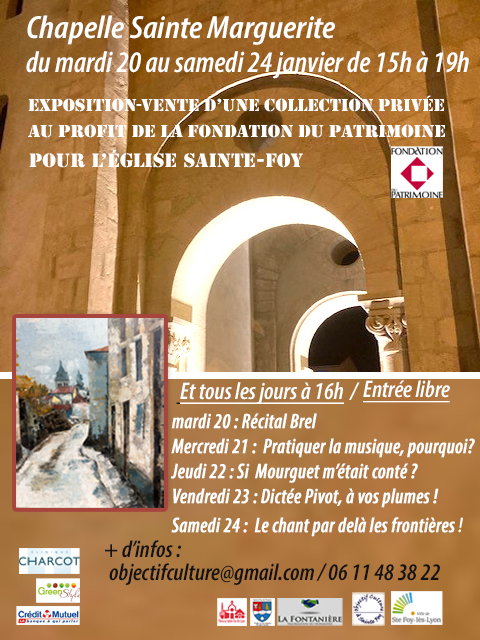 La Fondation du patrimoine organise une exposition-vente à la chapelle Sainte-Marguerite tous les après-midis du 20 au 24 janvier de 15h à 19h au profit de la restauration de l’église Sainte-Foy.