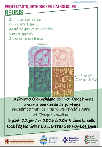 Dans notre paroisse, le Groupe Œcuménique de Lyon-Ouest organise une soirée débat le jeudi 22 janvier à 20h15 dans la salle sous l'église Saint-Luc. Vous pouvez télécharger le tract.